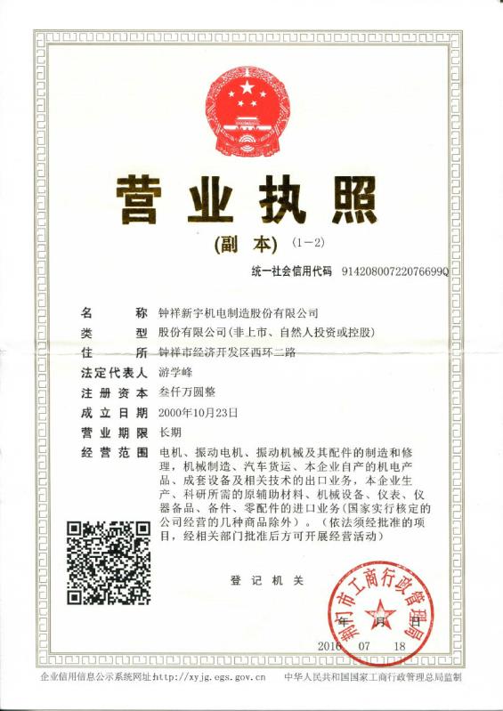 ? ? ? ?鐘祥新宇機(jī)電制造股份有限公司前身是鐘祥電機(jī)廠,1968年 籌建工廠,原機(jī)電部確認(rèn)為定點(diǎn)生產(chǎn)中小型電機(jī)的專業(yè)廠家。于2014年09月24日由“鐘祥新宇機(jī)電制造有限公司”變更名為“鐘祥新宇機(jī)電制造股份有限公司”。主要生產(chǎn)各類振動(dòng)電機(jī)、振動(dòng)機(jī)械、輸送機(jī)械。是中國(guó)電器工業(yè)協(xié)會(huì)中小型電機(jī)分會(huì)理事單位、中國(guó)重型機(jī)械工業(yè)協(xié)會(huì)洗選設(shè)備專業(yè)委員會(huì)理事單位,是中國(guó)大型的振動(dòng)電機(jī)生產(chǎn)廠家。
