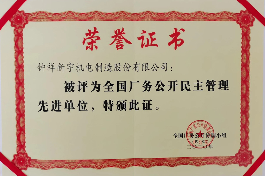 全國廠務公開民主管理先進單位每三年表彰一次,湖北省今年共計有15家企業榮獲該榮譽稱號,鐘祥新宇機電制造股份有限公司作為 湖北省唯一的一家中小型民營制造企業榜上有名。